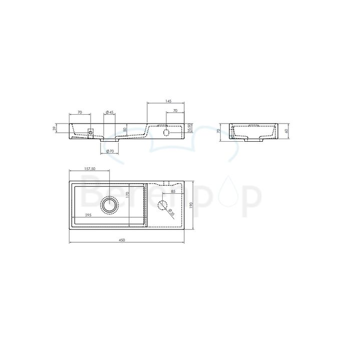 Clou Mini Wash Me CL0308135 mineral marmer fontein wit 45cm met voorbewerkt kraangat zonder plug rechts Wandhangend en als opzetfontein te monteren.